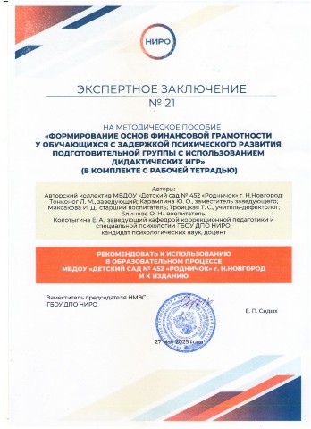 В 2024году разработано, апробировано и получило заключение НЭМС ГБОУ ДПО НИРО методическое пособие «Формирование основ финансовой грамотности у обучающихся с ЗПР подготовительной группы» в комплекте с рабочей тетрадью».
